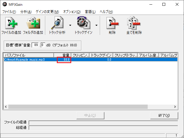 音量の変更処理が完了すると、対象ファイルの「音量」項目の数値が指定の値に変更される。