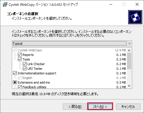 続いて、コンポーネントの選択画面が表示される。