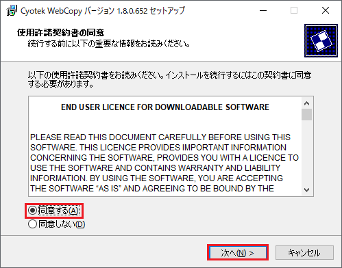 インストーラーが起動すると、最初に使用許諾書の同意を行う画面が表示される。