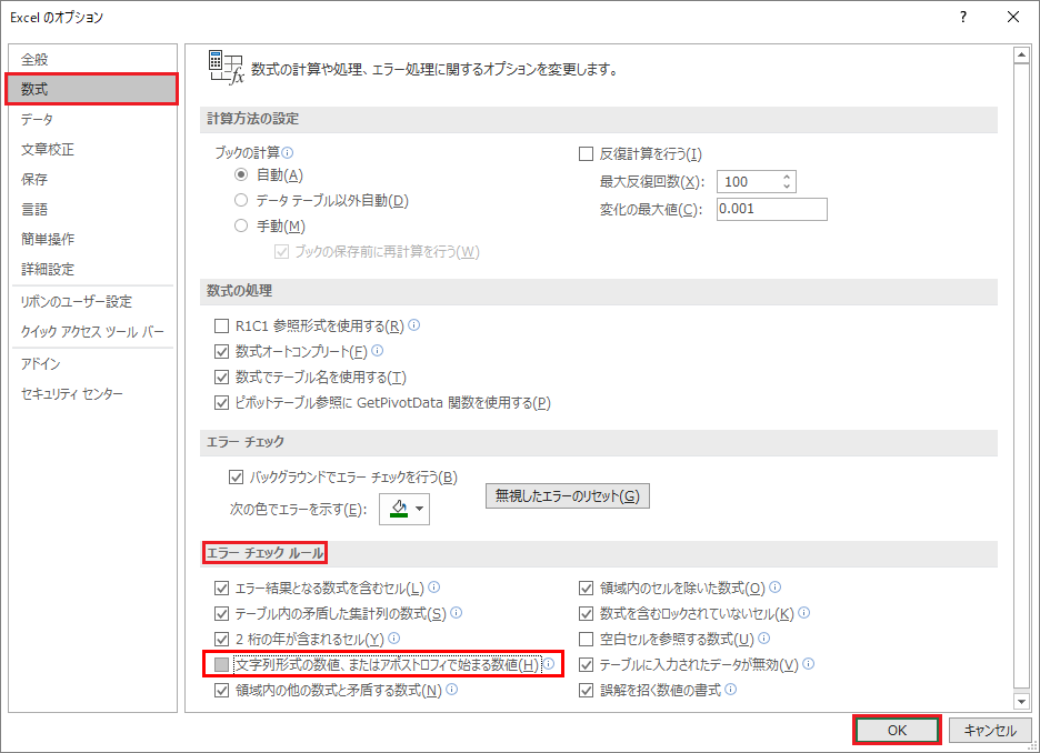 ここでは「数式」を選択し、「エラーチェックルール」内の「文字列形式の数値、またはアポストロフィーで始まる数値」の項目のチェックを外そう。