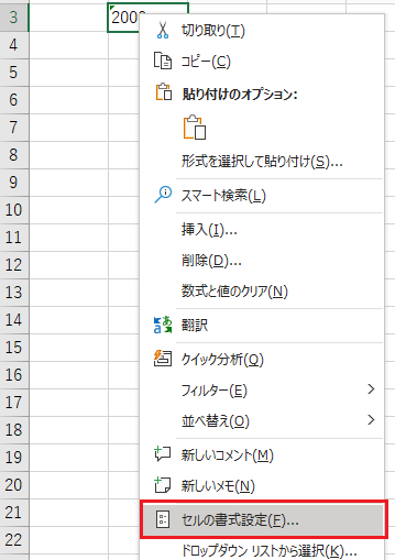 セルを右クリックすると以下のようなメニューが表示されるが、メニューの下部にある「セルの書式設定」を選択すると、前述のセルの書式設定画面へ遷移することができる。