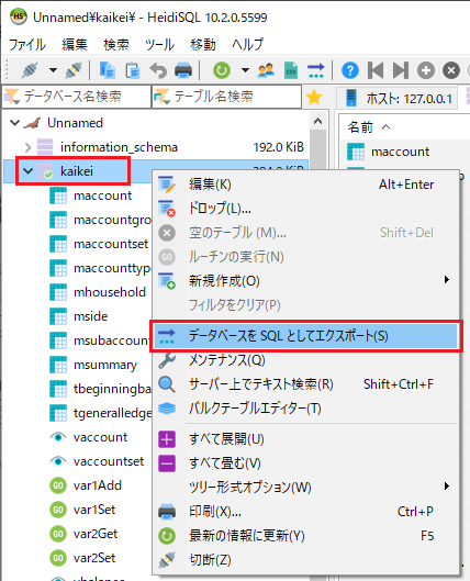 左側のウィンドウに「kaikei」という名前のデータベースが存在しているのが見えるが、今回は試しにこれをバックアップしてみることにする。