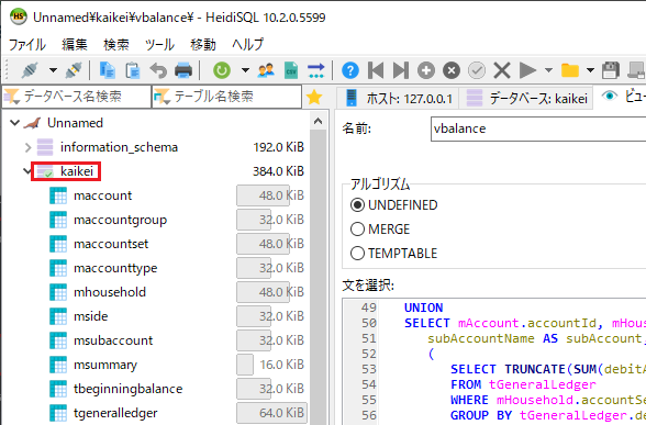 前述の「kaikei」データベースの場合は、以下のようなSQL文が生成されていた。