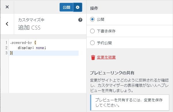 具体的には、名前が「powered-by」のクラスは画面に表示しないというCSSコードを追加する。