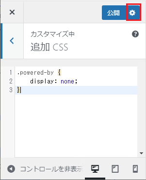 赤枠の部分に、「powered-by」クラスを非表示にするCSSコードを追加しよう。