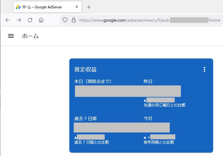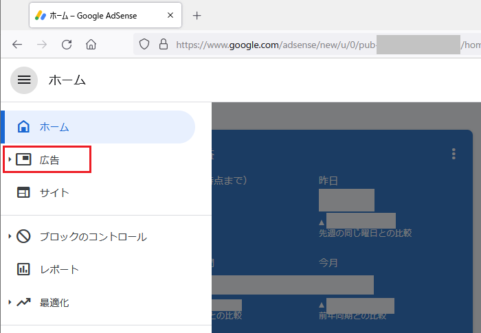 すると、以下のようなGoogleアドセンスのホーム画面が表示される。