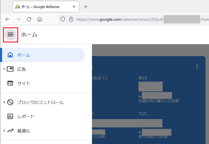 Googleアドセンスのトップ画面が表示されたら、左上の漢数字の「三」のような形状のメニューアイコンを選択しよう。