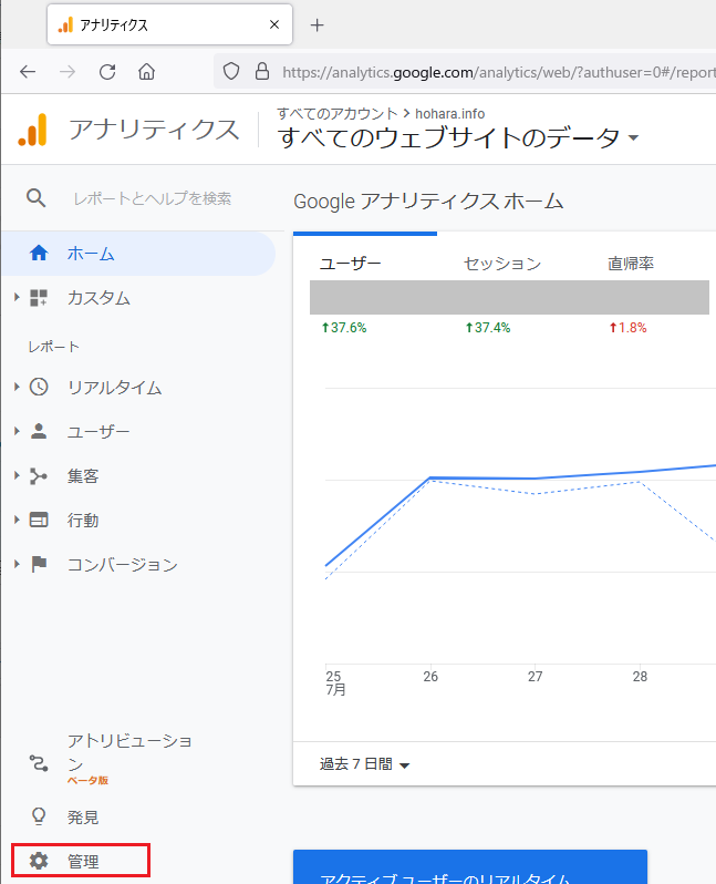Googleアナリティクスのトップ画面が表示されたら、画面左下の「管理」を選択しよう。