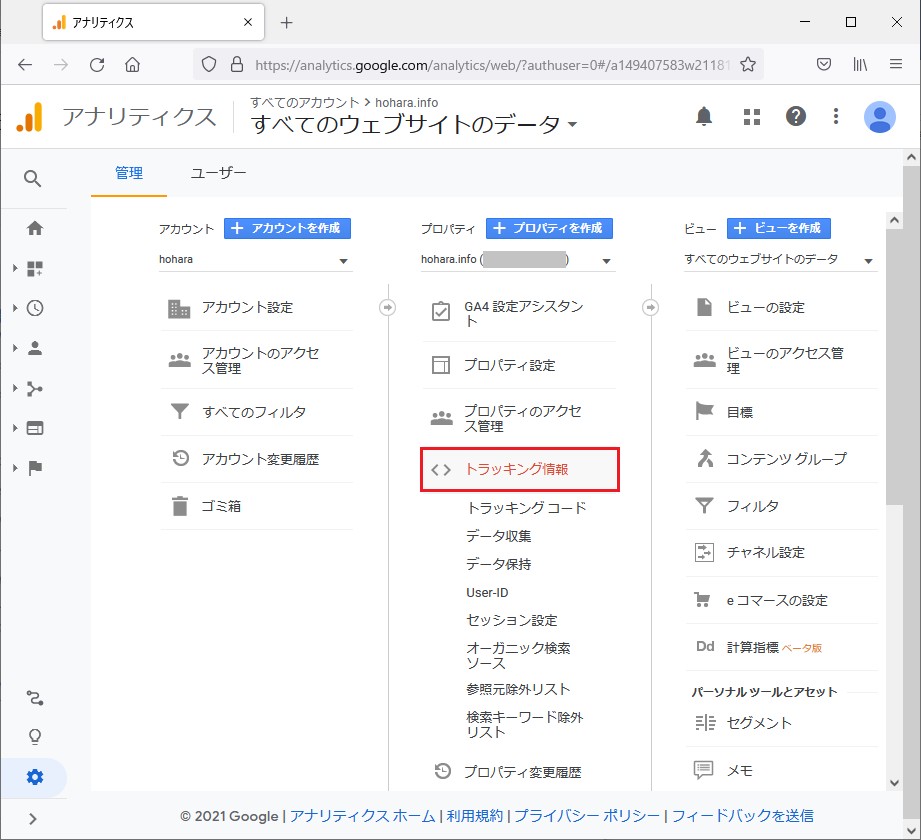 続いて、画面上の真ん中の「プロパティ」列の上から4つ目の「トラッキング情報」を選択しよう。