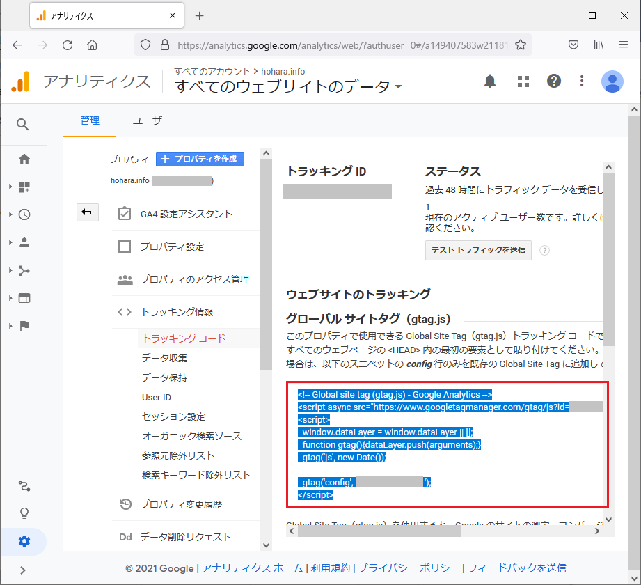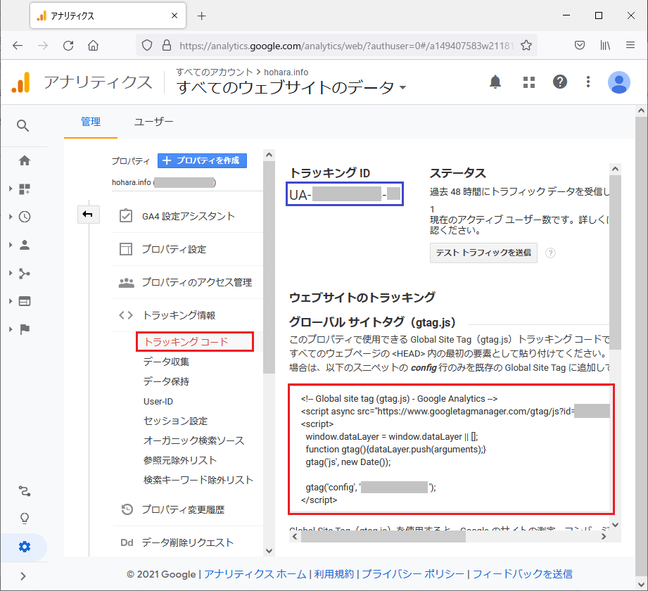 「UA-」に続いて「123456789-0」 のようなハイフン区切りの数字列が表示されているはずだ。