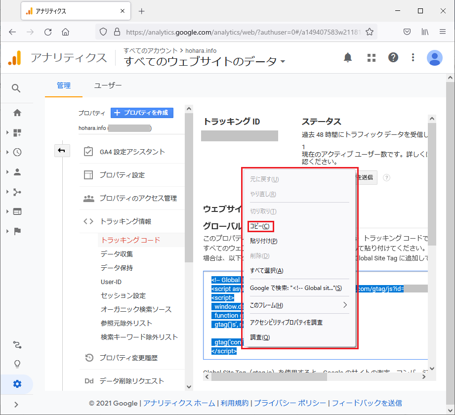 以上で、Googleアナリティクスの修復に必要な「グローバルサイトタグ」のコピーは完了だ。