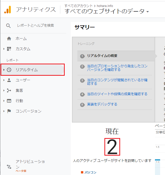 そこまで待てない場合は、Googleアナリティクスのサイトで「リアルタイム」を選択しよう。