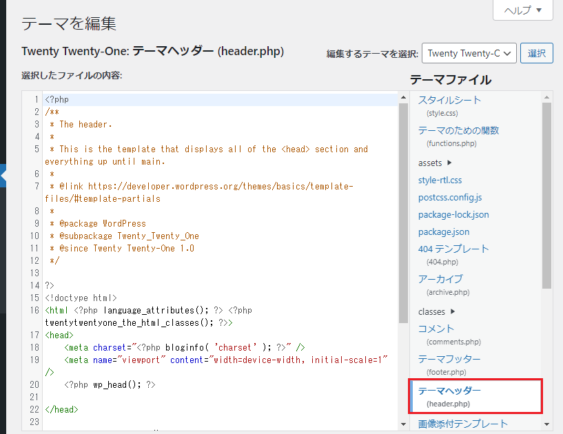 上記画面の左側にテーマヘッダーのソースコードが表示されている。