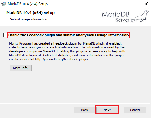 「Enable the Feedback plugin and submit anonymous usage information」の前にあるチェックボックスをチェックすると、データベースの利用状況がなどがMariaDBの開発チームに匿名で送信されるようになるものと思われる。