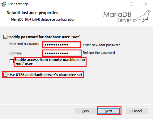 続いては「root」ユーザーのパスワードや、データベースの文字セットを設定する画面が表示される。
