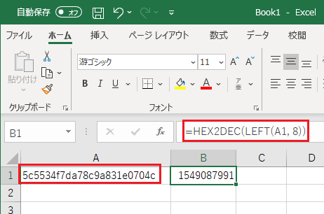 A1セルにObjectIDが格納されている場合、以下のような式を使ってUnix時間を求めることができる。