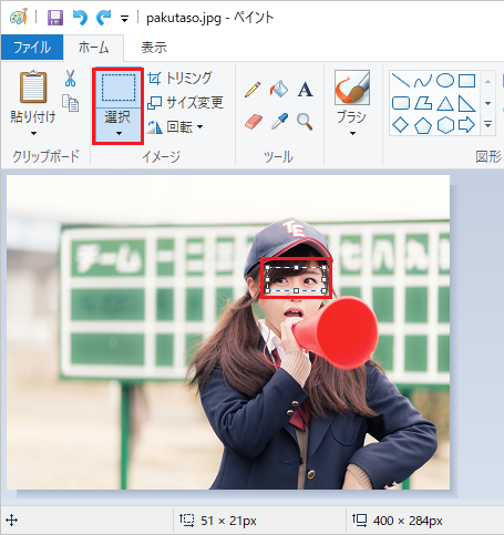 続いて、モザイク化したい部分を「選択」カーソルで選択しよう。