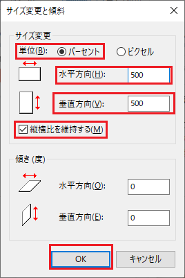 再び「サイズ変更と傾斜」ウィンドウが表示されるので、今度は「水平方向」の入力エリアに「500」と入力しよう。
