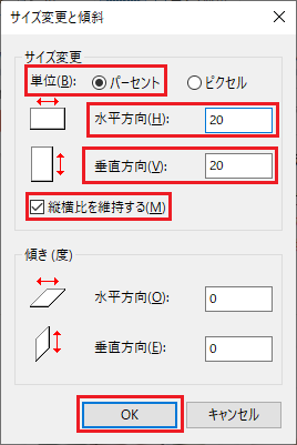 すると、「サイズ変更と傾斜」ウィンドウが表示される。