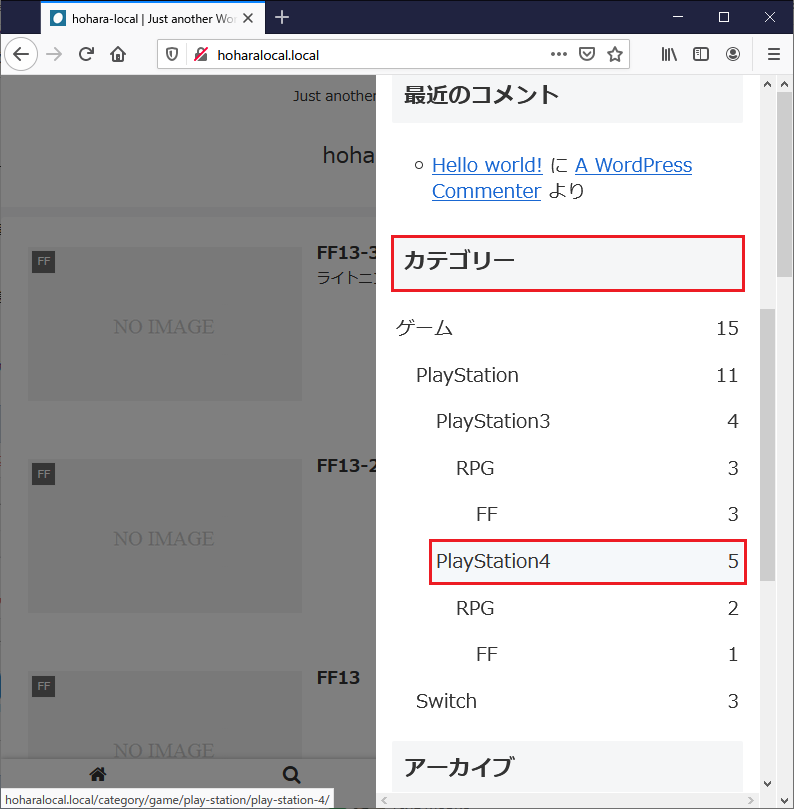 また、上層の「PlayStation」カテゴリーとさらに上層の「ゲーム」カテゴリー、および下層の「RPG」カテゴリーやさらに下層の「FF」カテゴリーにも記事が投稿されている。