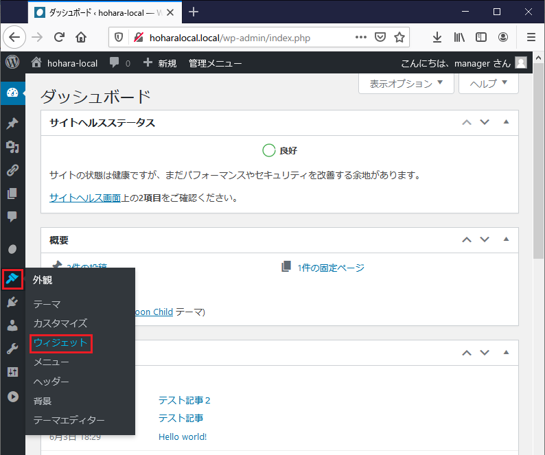 まずは、WordPressの管理画面からサイドバーの「外観」を選択し、さらに表示されたサブメニューから「ウィジェット」を選択しよう。